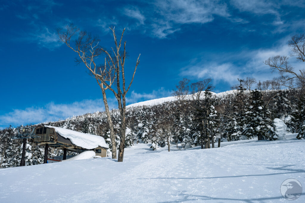傾斜が一旦緩やかになりリフト下り場が見えてきました。このリフトは昔稼働していた第4リフトの跡らしく、古い登山記録を調べているとここから登り始めるものもありました。これが動いてたら大分ショートカット出来るのになーと思いつつ通り過ぎていきます。