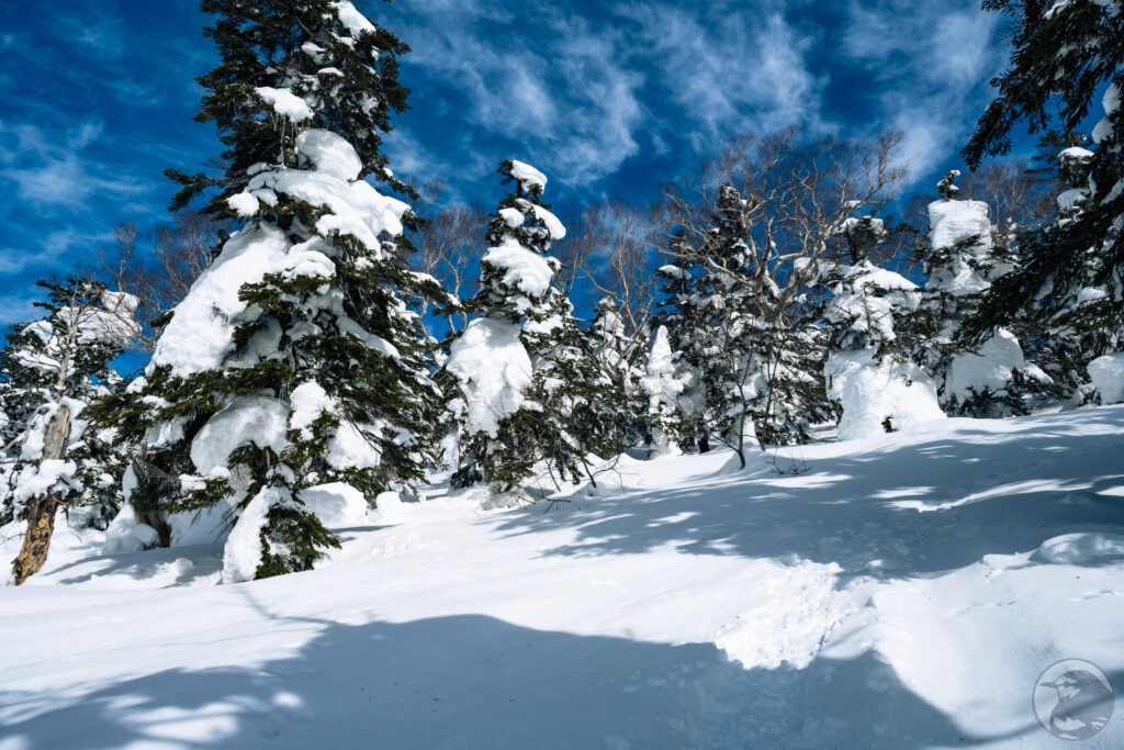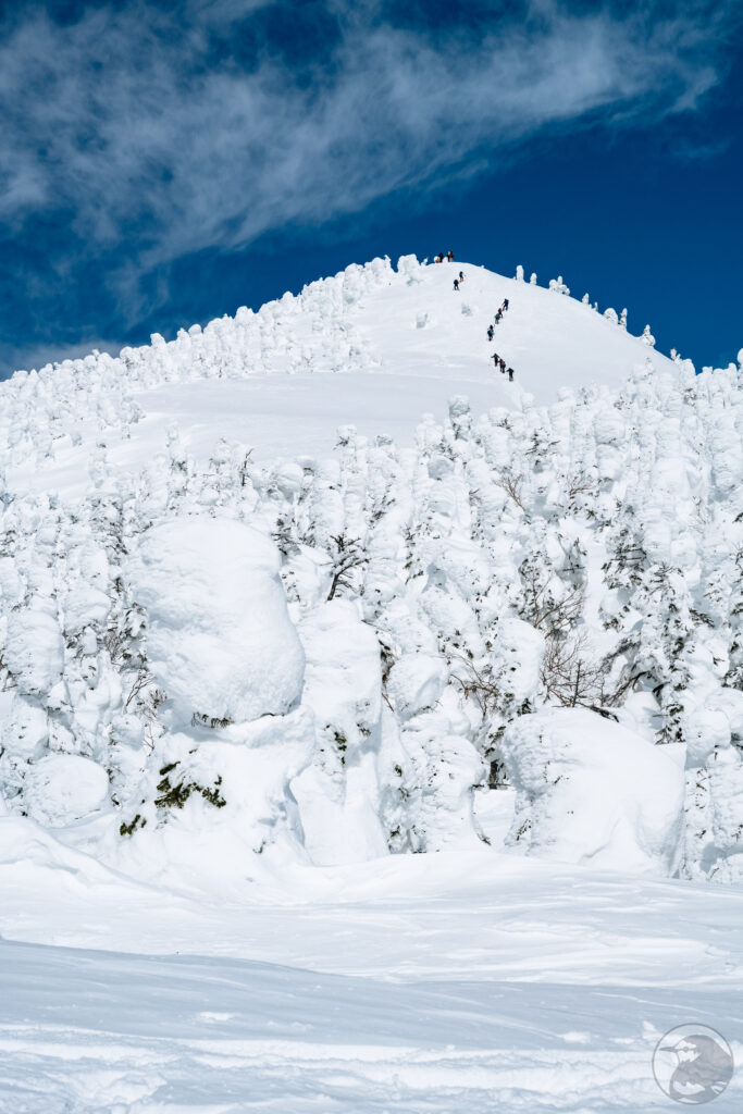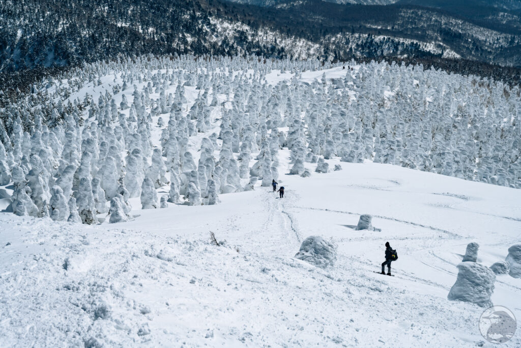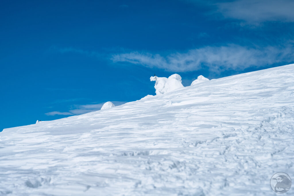ここまで来ると木々はすっかり氷雪に覆われています。ボコボコした不思議な形をしていてモンスターという表現がピッタリです。