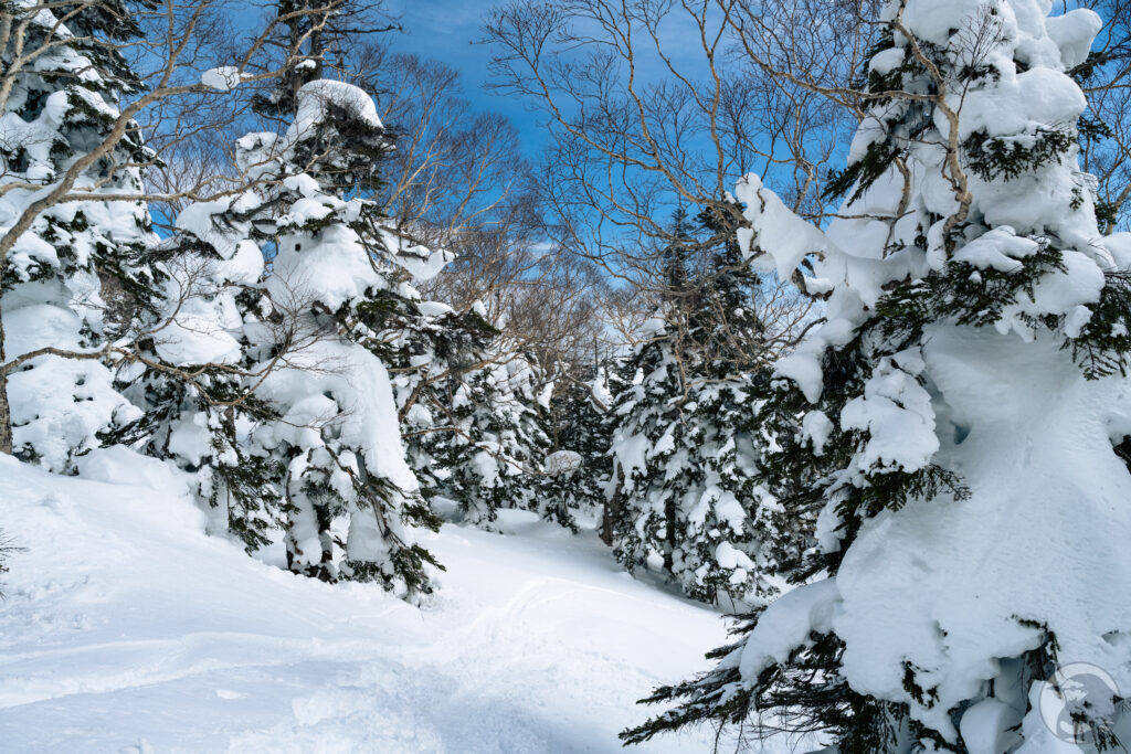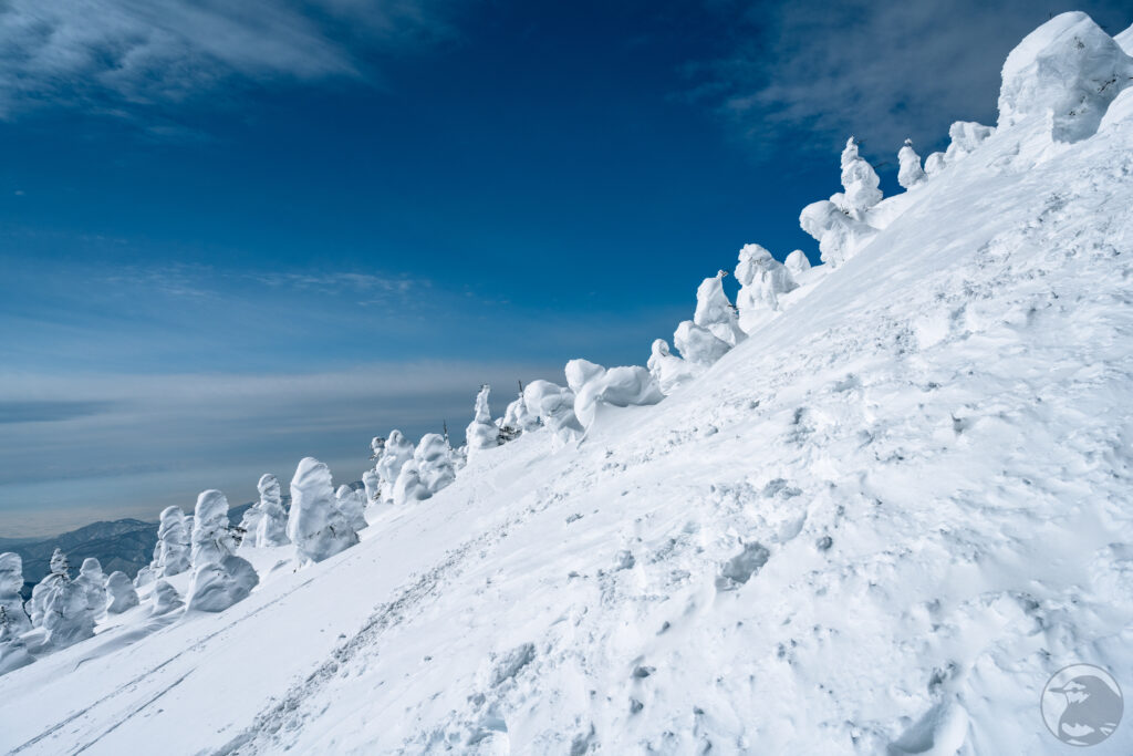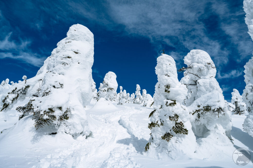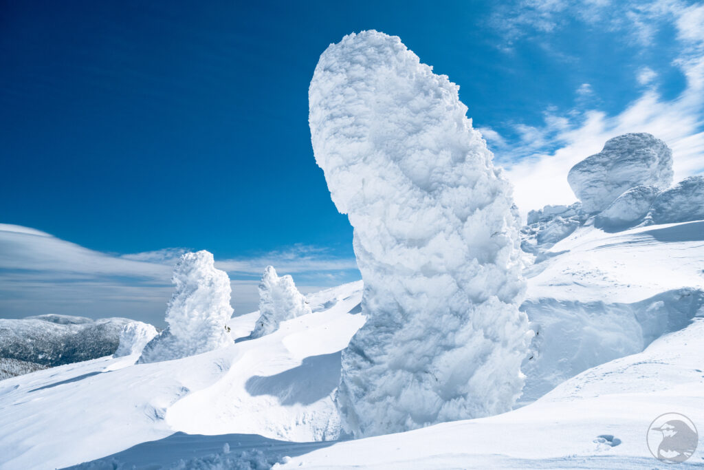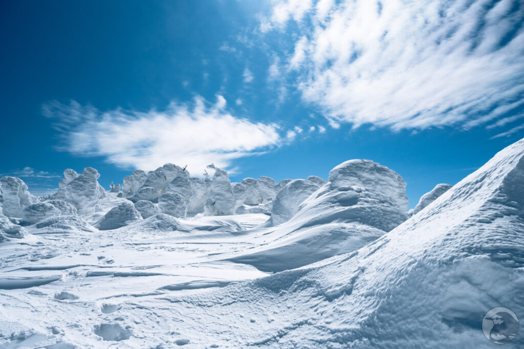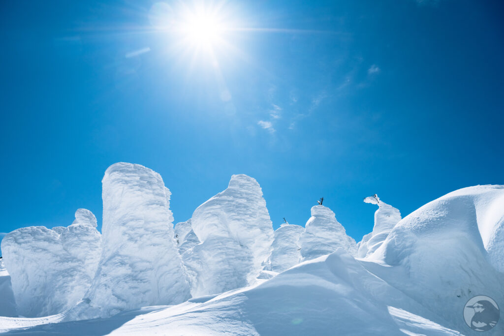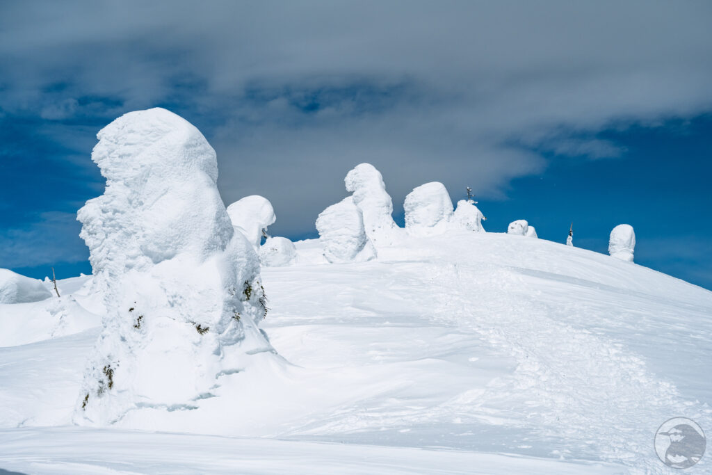 真っ白な樹氷と抜けるような青い空。斜面の下から見上げるように眺めているとファンタジーの世界に迷い込んだかのような気分、不思議な造形の「リトルモンスター」は今にも動き出しそうな迫力です。