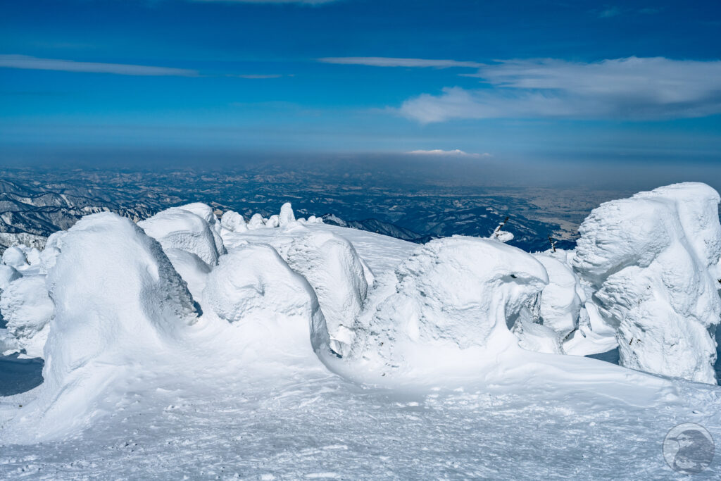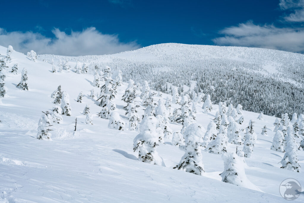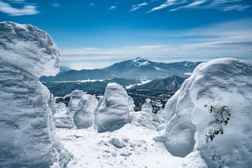 福島と山形の県境に聳える吾妻山は日本百名山の一座にして樹氷の名所。自然の作り上げる複雑で有機的な造形から”スノーモンスター”とも言われる樹氷ですが、吾妻山の樹氷は他山域のものと比べて小さく可愛らしい姿が特徴で”リトルモンスター”と呼ばれて親しまれています。小さいとはいえ元は樹木なので、その大きさは人の背丈を優に超える程。なだらかに連なる吾妻の山々を白い氷塊が覆い尽くす様は圧巻です。