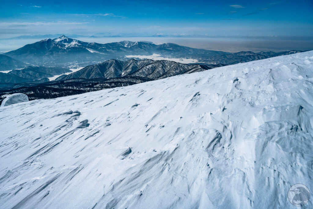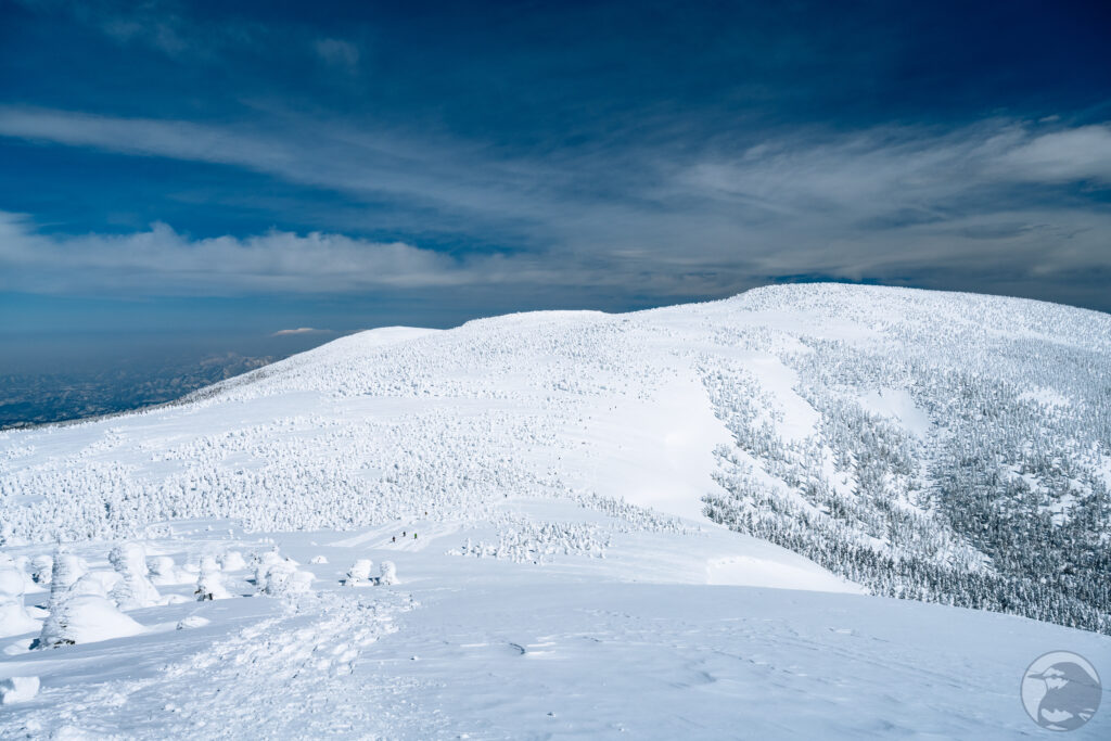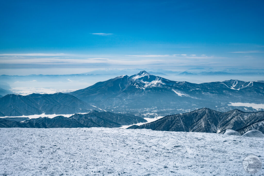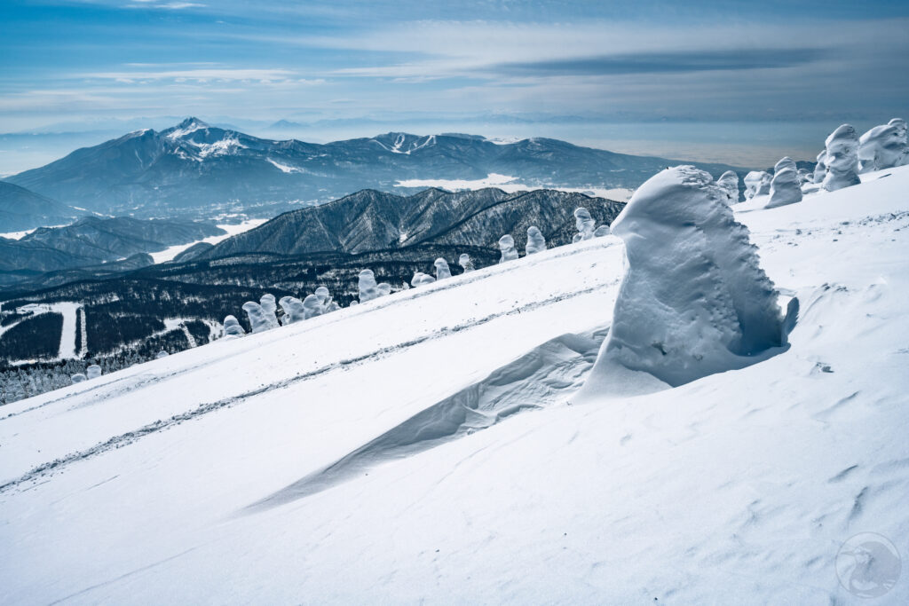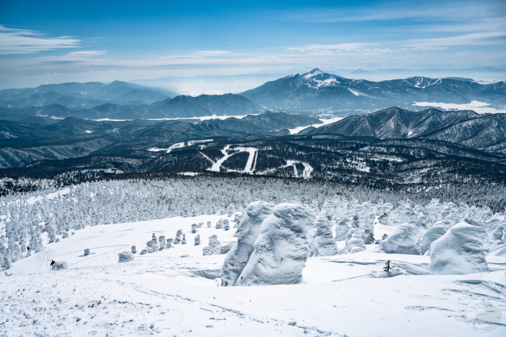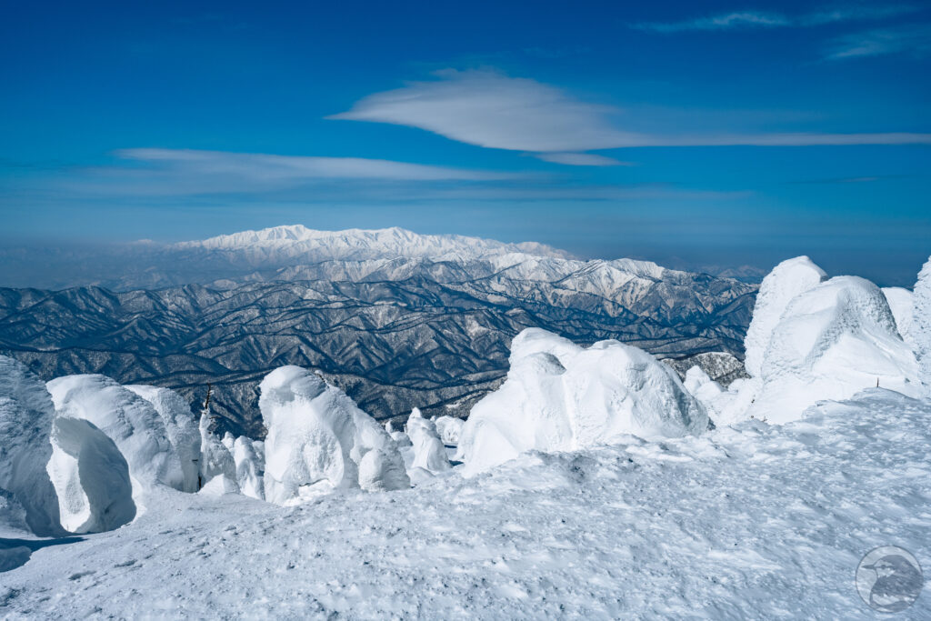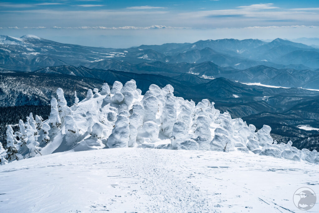 西大巓のピークからは樹氷とともに周囲の山々を見渡すことが出来ます。