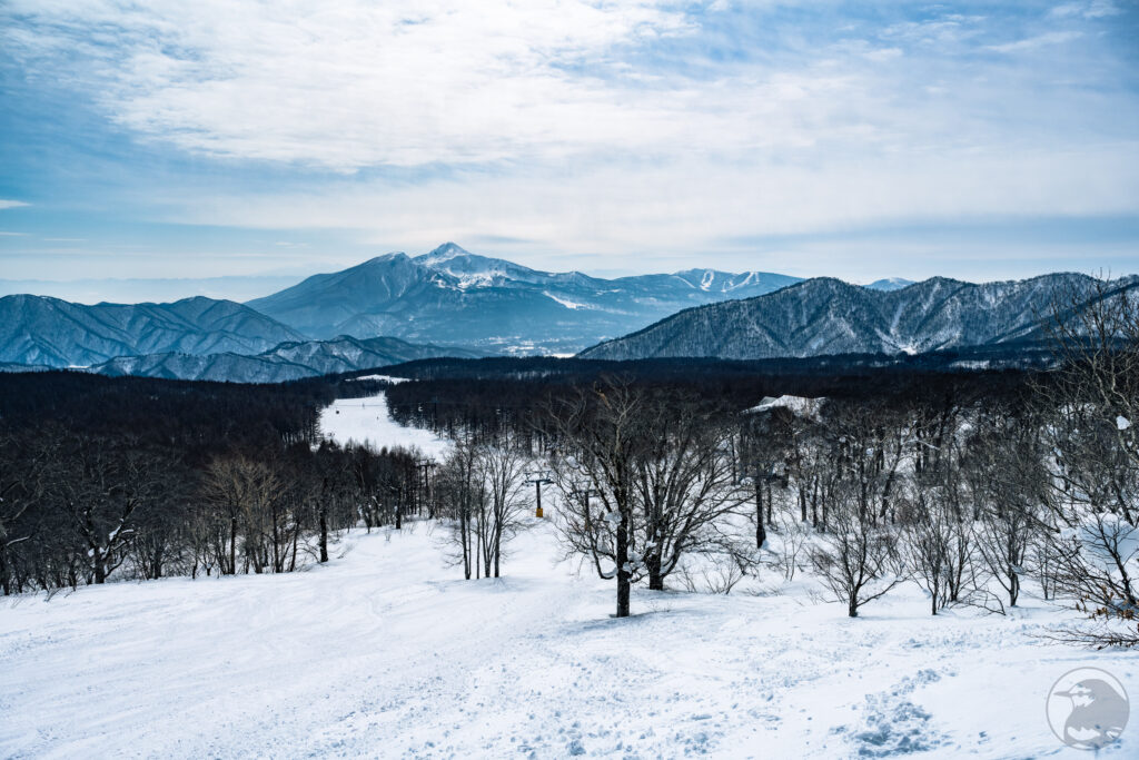 振り返ると磐梯山がどんと聳え立っています。ゲレンデから既に絶景ですね。