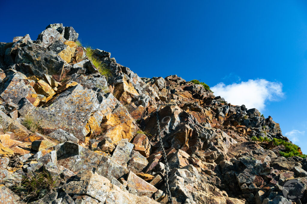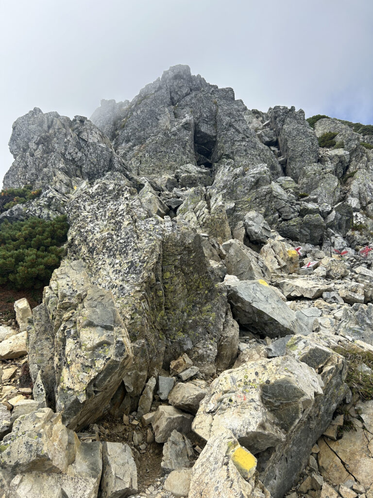 最大の難所は五竜岳山頂直下の岩場です。見た目は地味なのですが岩の表面が平滑でグリップが効きにくく結構滑りやすいです。乗り越えが必要が何ヶ所かあり、そこで一度足を滑らせて鎖を掴んでいなかったら転倒しそうになりました。高度感があまり無いので緊張感が抜ける上に山頂直下で気持ちは焦りがちになるので、こういう場所ほど気をつけて進む必要があると実感しました。