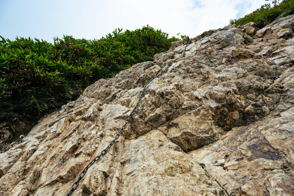 唐松岳から五竜岳へ向かう縦走路の最初の方には牛首と呼ばれる岩場や鎖場があります。ここの難易度はそこまで高くないのですが高度感はかなりのものです。ヘルメット着用奨励山域では無いですが着けていた方が安心だと思います。