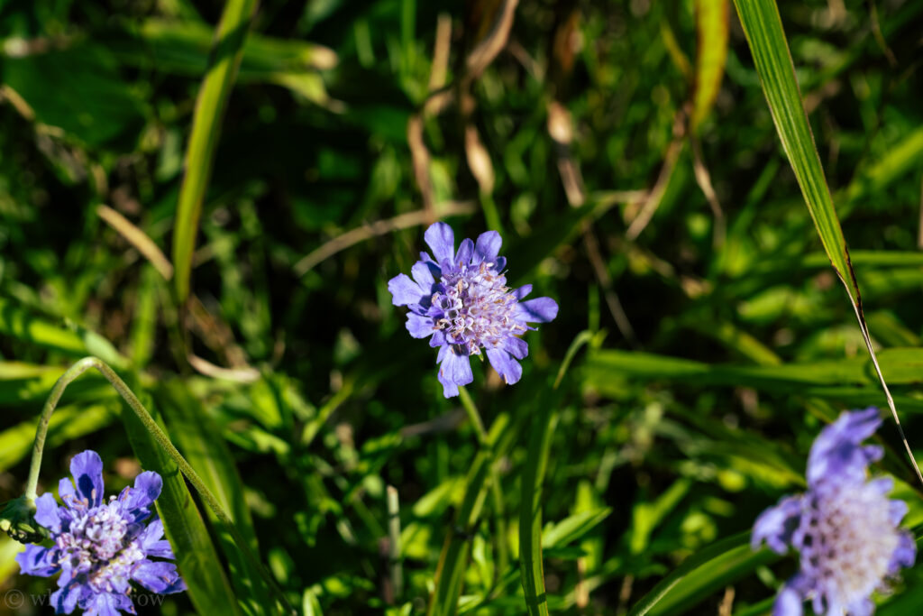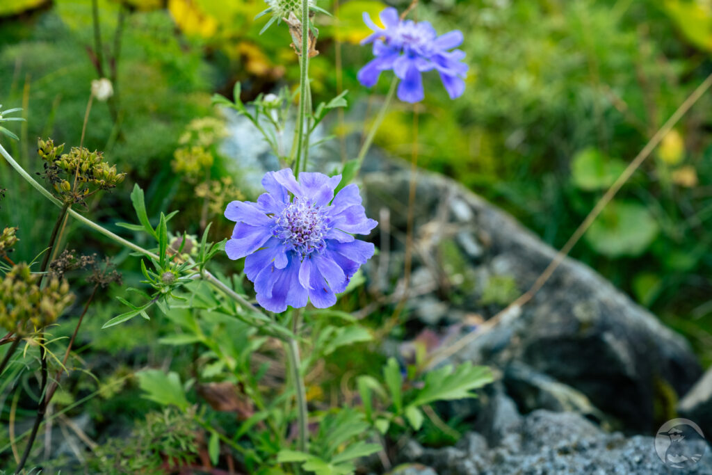 八方池の周りにはタカネマツムシソウの群落が点在していました。マツムシソウの高山型で背が低いが花が大きいのが特徴です。これもやっぱり見分けが難しいので、標高の高い八方尾根に咲いているからタカネマツムシソウだろうと思いながら撮っています。参考までに福島の額取山で撮ったマツムシソウと並べておきます。花を撮ると茎から根本まで写り込むのがタカネマツムシソウの背の低さを表しているような気がします。