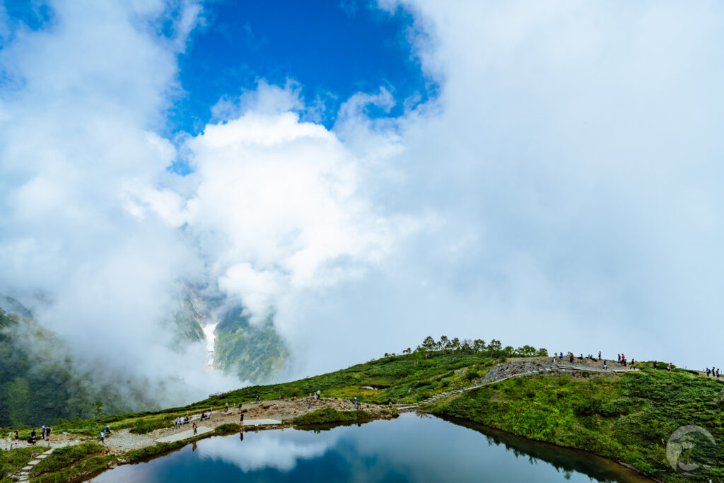 ということで東方向に目を向けてみると真っ白な雲が白馬三山を覆っていました。まあ青空が見えるだけ良いかなという感じです。八方池の畔では色んな格好の人が思い思いに池の景色を楽しんでいます。
