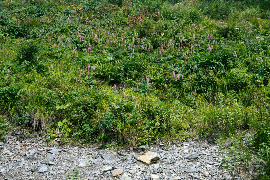 植生の垂直分布においてはダケカンバ林のような亜高山帯の上に高山植物の生える高山帯が分布するはずなのですが、八方尾根においてはこの順序が逆転しています。この現象は八方尾根を構成する蛇紋岩が主因となって樹林帯の形成が抑制されることで生じる植生の「逆転現象」と呼ばれていて、リフトから降りてすぐに高山植物が楽しめるのはこうした地質学的特徴などが深く関係しています。