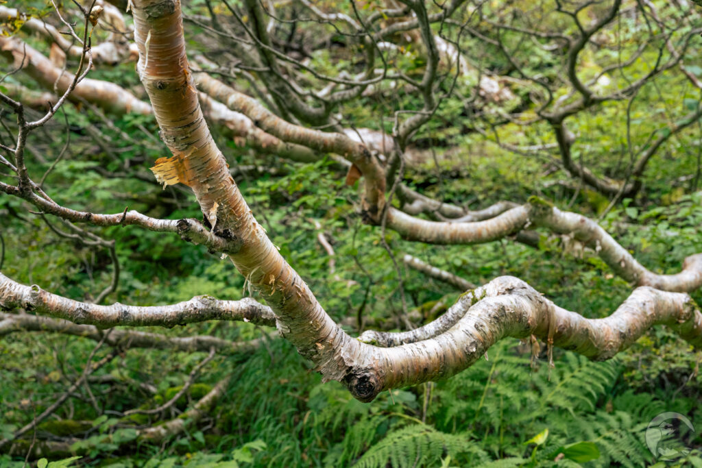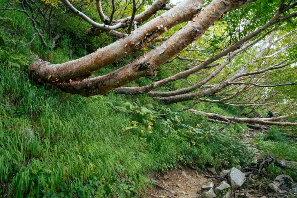 上ノ樺ではダケカンバが横向きに生える場所を通り抜けていきます。横というかもはや下向きに伸びています。大量に降り積もる雪にも負けず大きく成長するダケカンバの生命力はすごいです。