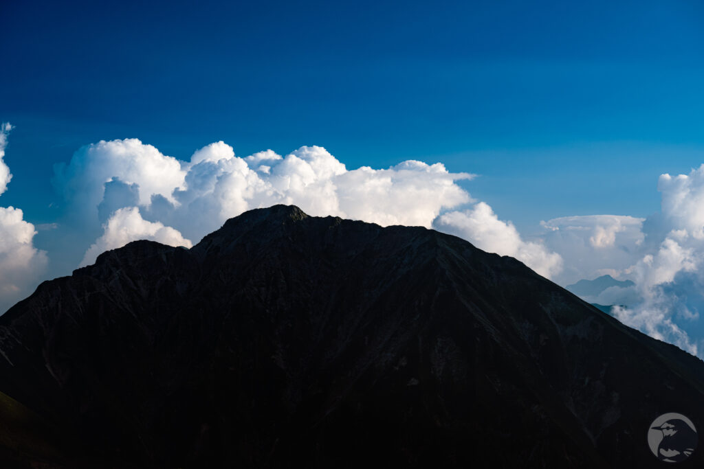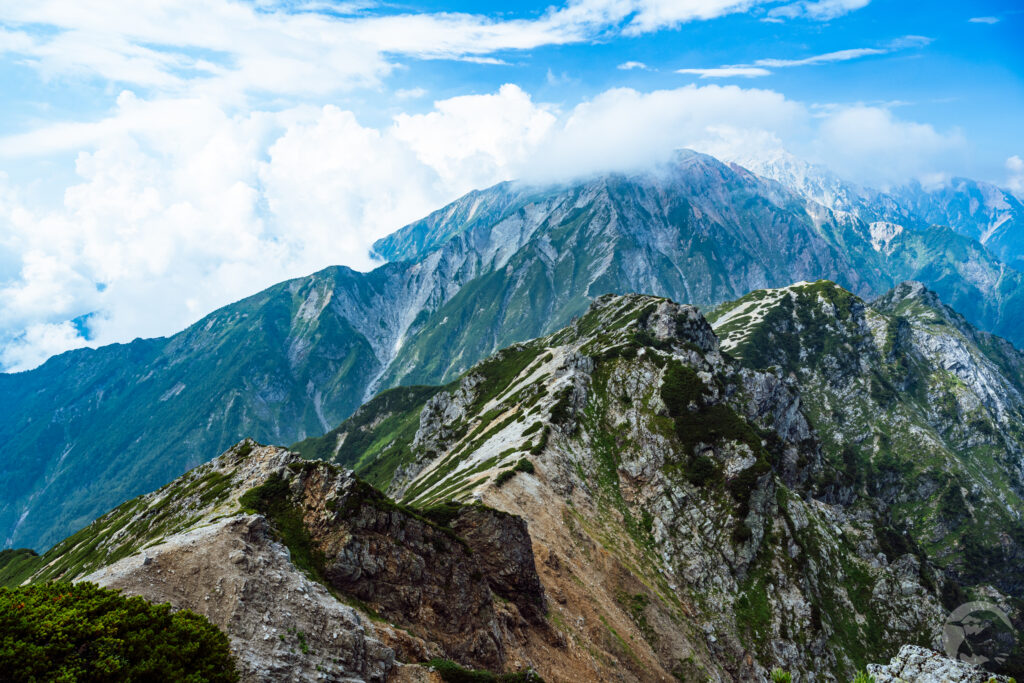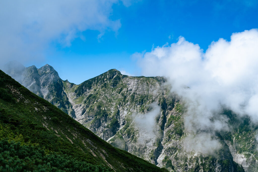 ここでまた白馬の方へ展望が開けてくるのですが、ちょうど良く雲の切れ間から顔を覗かせてくれました。不帰の嶮の辺りでしょうか。ほんの数分で再び隠れてしまったのですが山に歓迎されているようで嬉しい限りです。