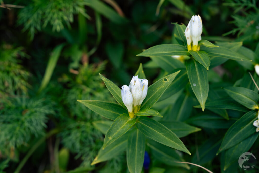そして目を引いたのがこの白っぽいリンドウ。白いリンドウといえばトウヤクリンドウですが、背が高く葉が互生していることからこれは白花のオヤマリンドウではないかと思います。白花もあると山渓ハンディ図鑑には載っていたのですが実際に見たのは初めてです。この辺りだけ白花の株が繁殖しているようです。