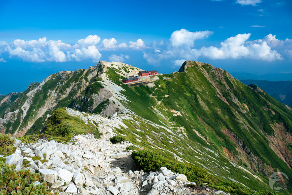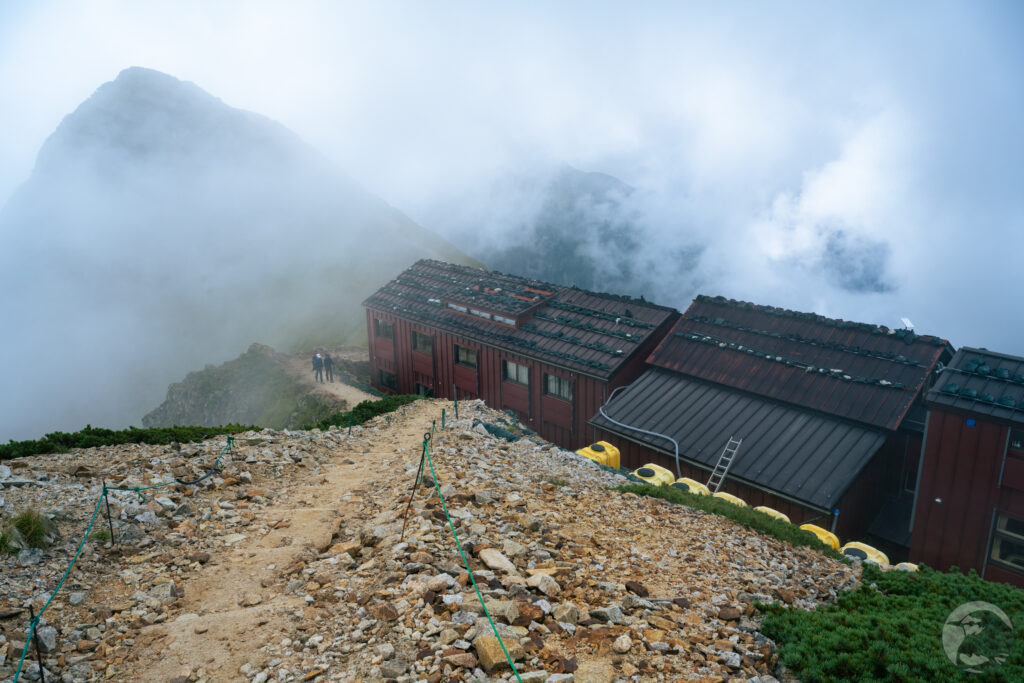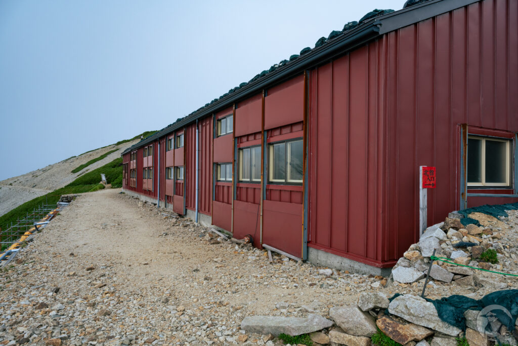 岩場を越えた先に頂上山荘の屋根が見えてきました。