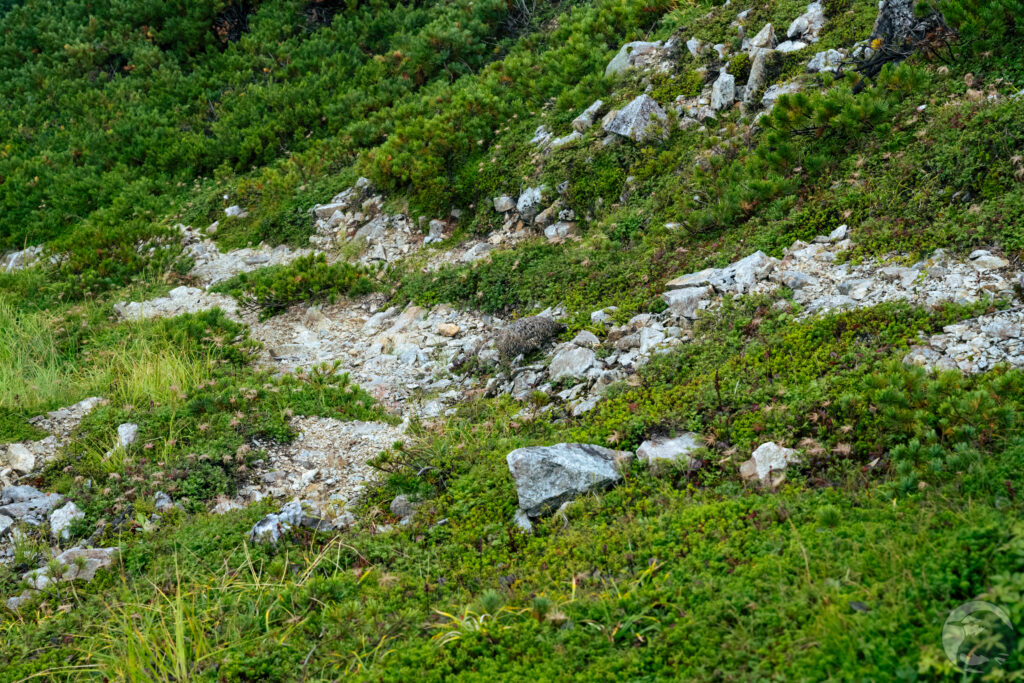 すれ違う方にライチョウが居たと教えて頂いたので注意深く見回していると、ハイマツ林の中でのんびりしている個体がいました。ちょっと遠いので望遠を持ってくればよかった。