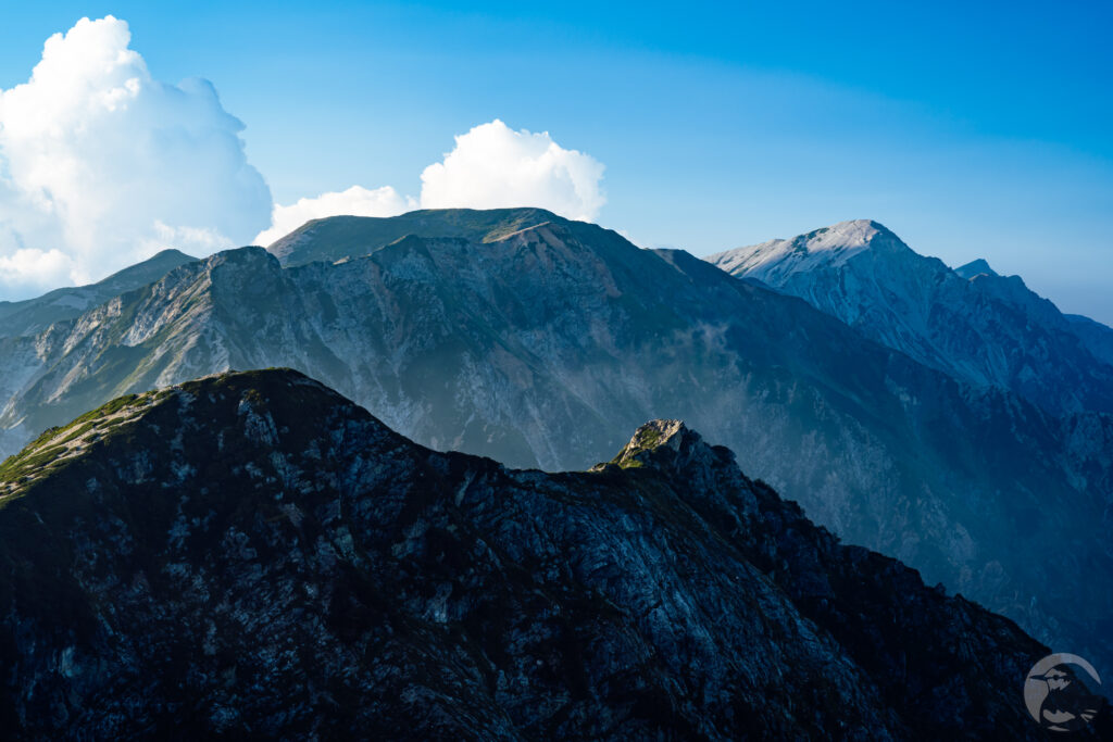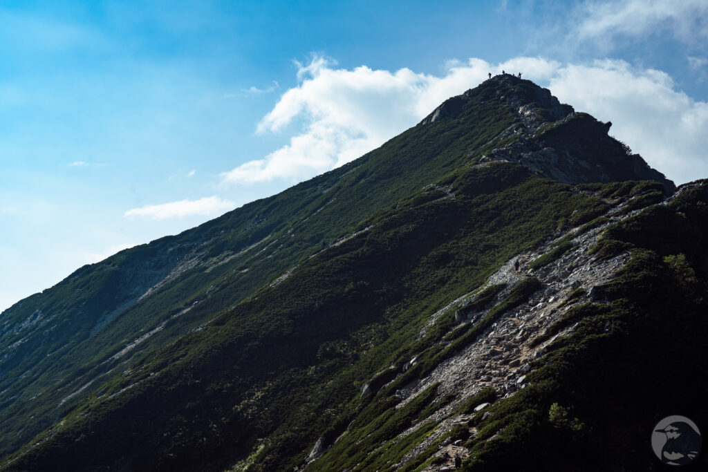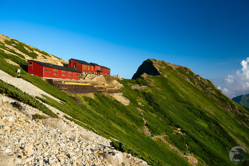 唐松岳から眺める頂上山荘です。こんな山の上に建てられるものなんだなーと色んな山小屋に行くたびに感嘆してしまいます。ここの山小屋は斜面にへばりつくように建っていて迫力があります。小屋の右下の方に道があり、斜面を下りた先がテント場になっています。小屋から大分離れていて大変そうではありますが周りに人が来ないのでゆったり過ごせそうです。右奥の高まりが明日通る牛首です。