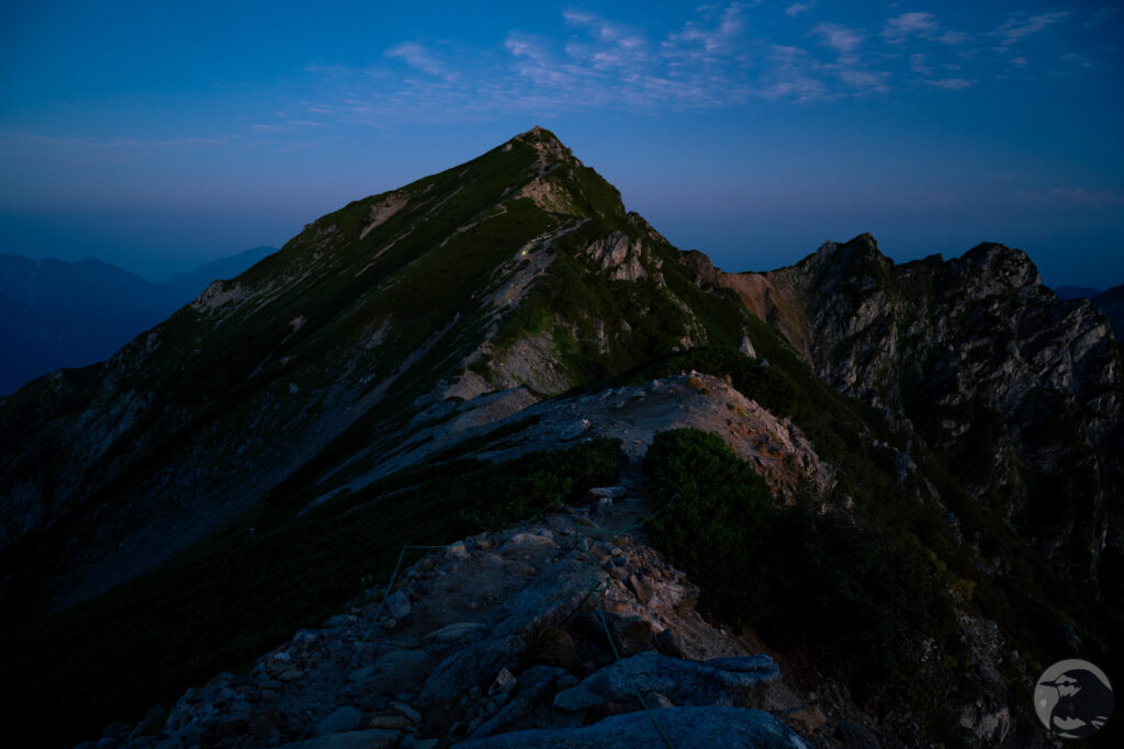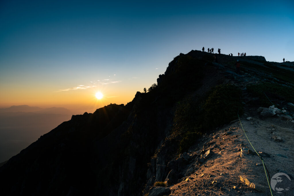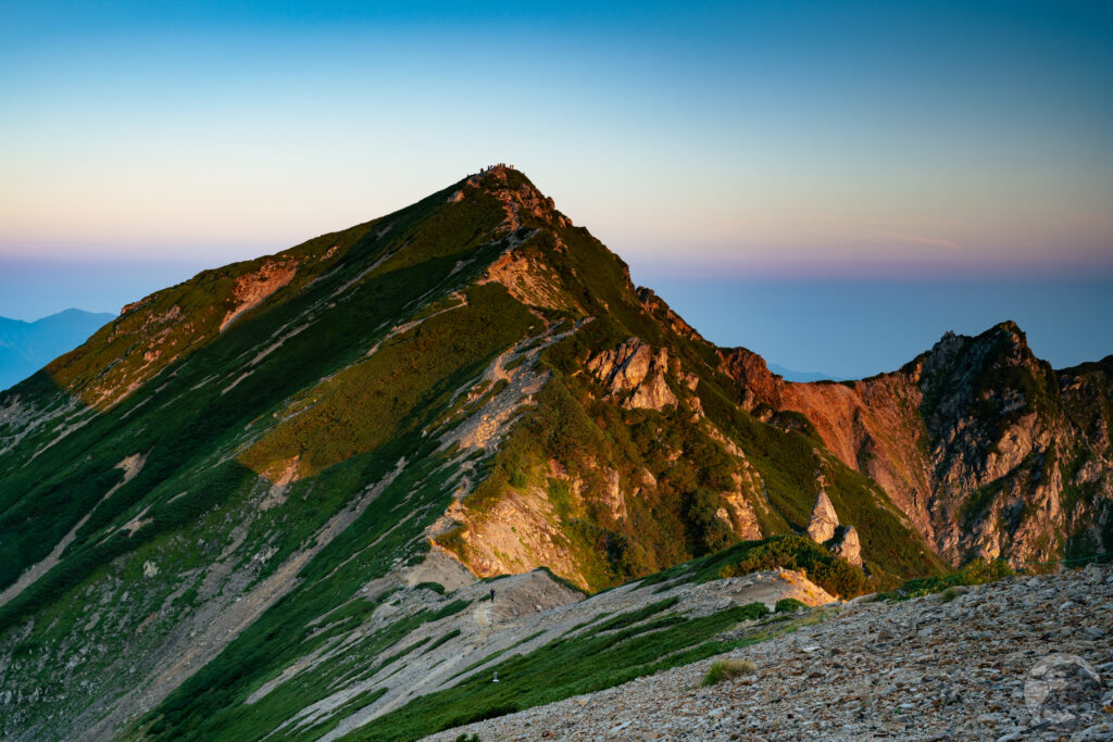日の出を見ようかなと朝5時前に三脚とカメラとちょっとの荷物だけ持って外に出ます。唐松岳の方を見ると山頂には既に結構人がいました。今回は朝日に照らされる唐松岳を見たいので小屋の近くで日の出を見ることにしました。