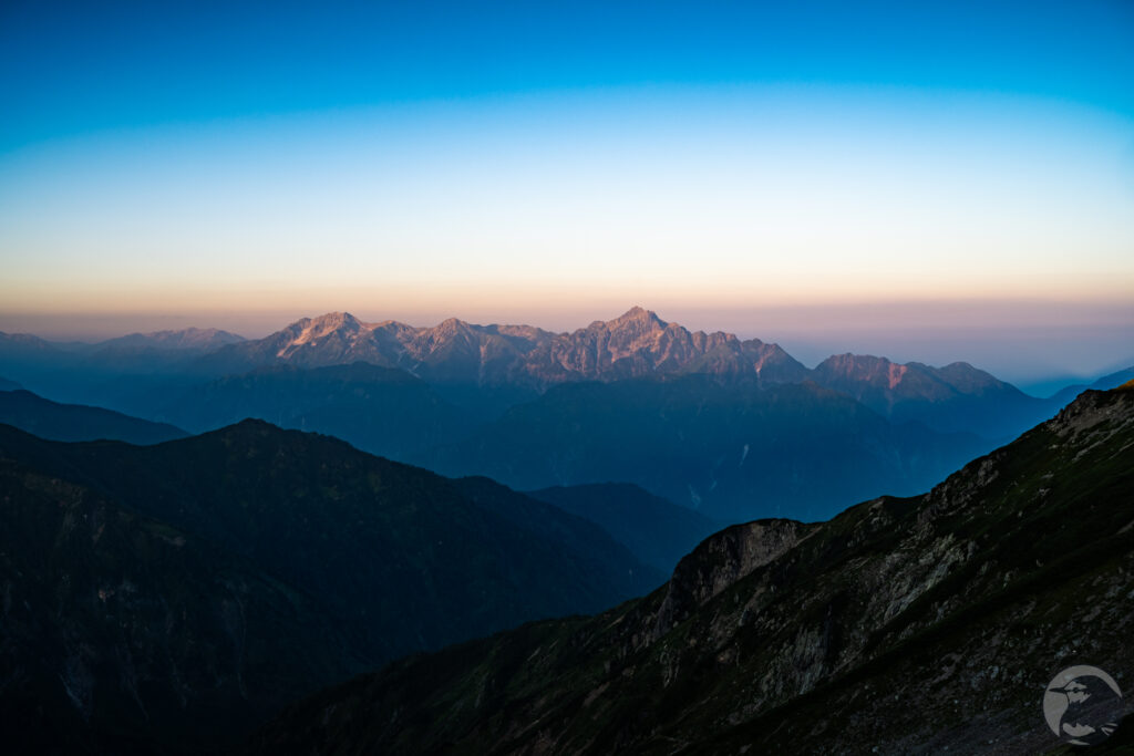 ほんのちょっとの間ですがモルゲンロートも楽しめました。唐松岳の山肌がぼんやり赤みを帯びて綺麗です。一瞬で終わってしまうのもまた趣がありますね。