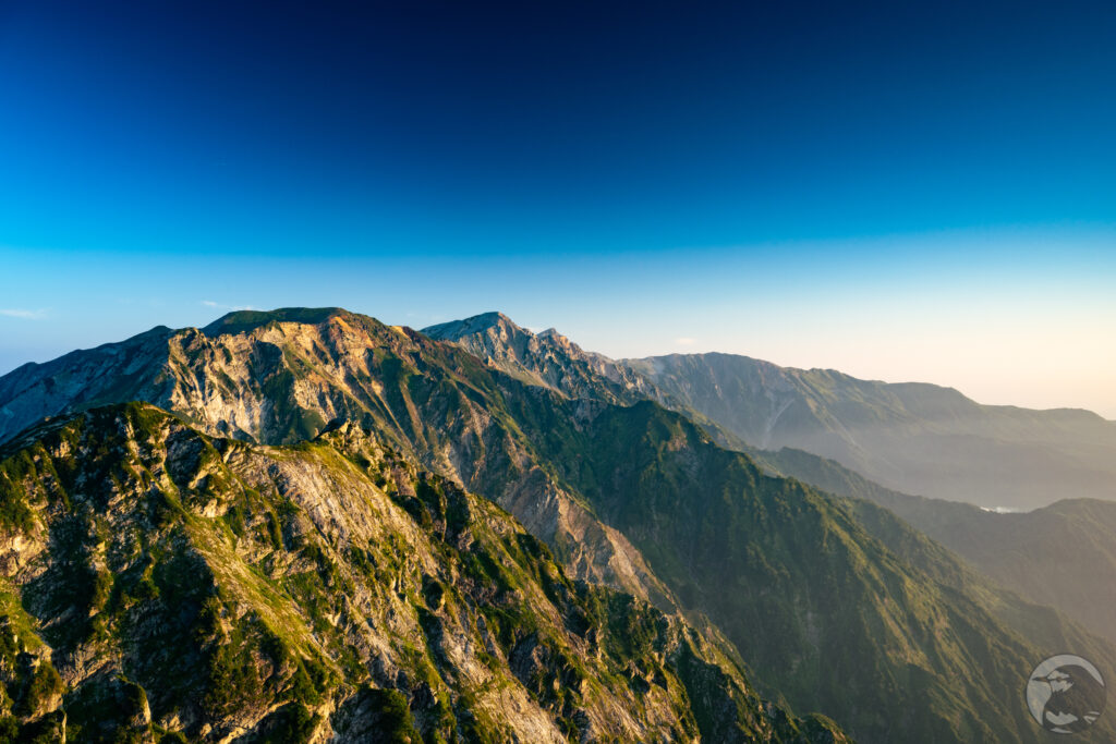 少し唐松岳の方に移動して白馬方面も眺めてみます。朝日に照らされ黄色く輝く不帰の嶮と靄の中に聳える白馬。次来たときは向こう側へ行ってみたいです。