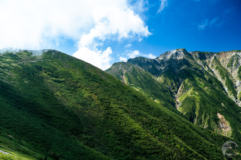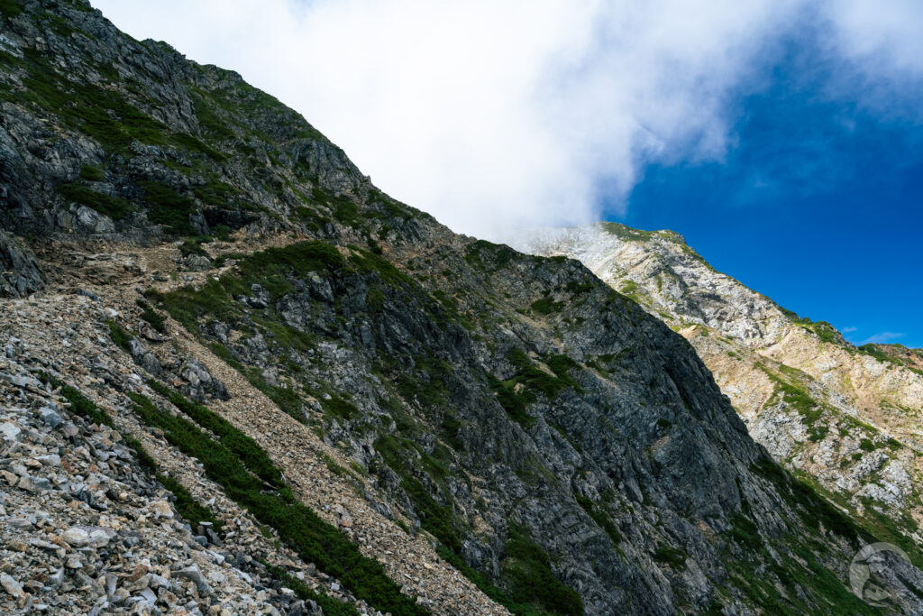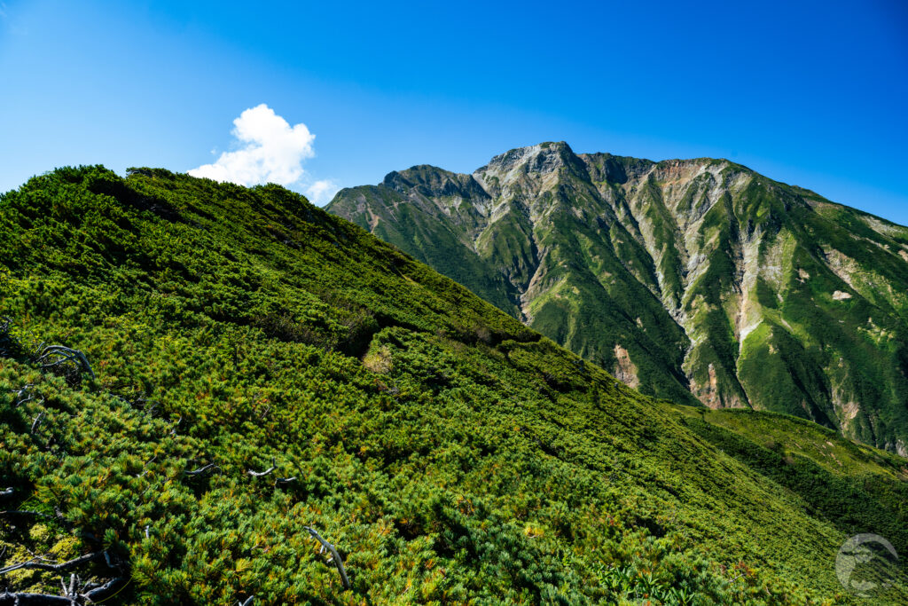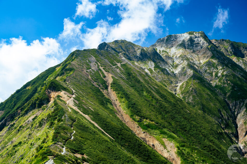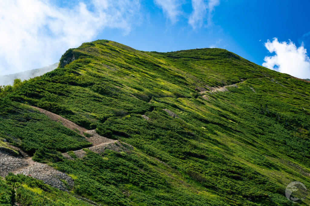 斜めに突き出た山塊にみっちりハイマツが生えて緑の壁のように聳え立ち、その表面に登山道がくっきり浮かび上がっています。