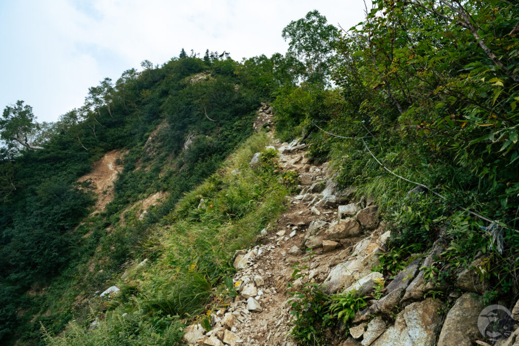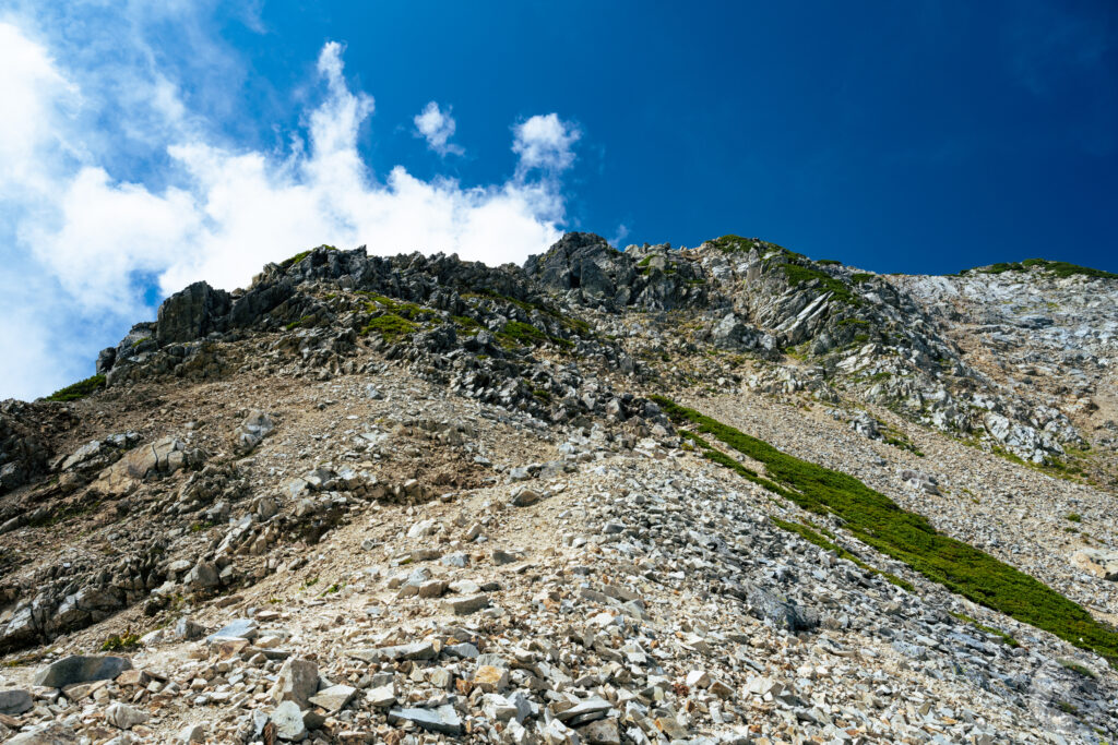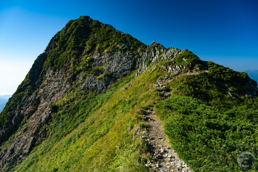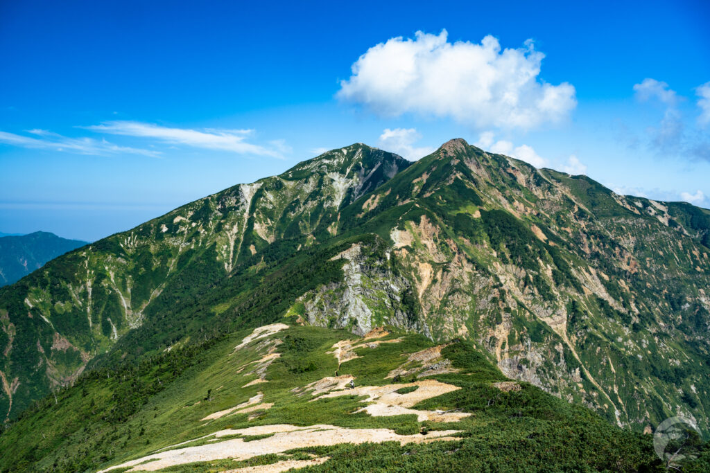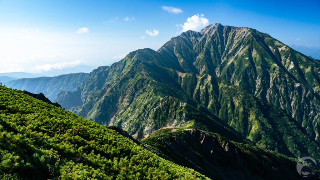 斜めに突き出た山塊にみっちりハイマツが生えて緑の壁のように聳え立ち、その表面に登山道がくっきり浮かび上がっています。