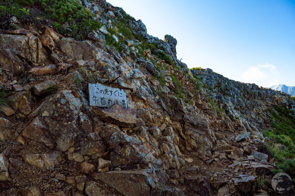 頂上山荘から唐松岳方面への入り口です。この岩山を登るの!?と思いきや右の方に巻いていく感じで道が通ってました。