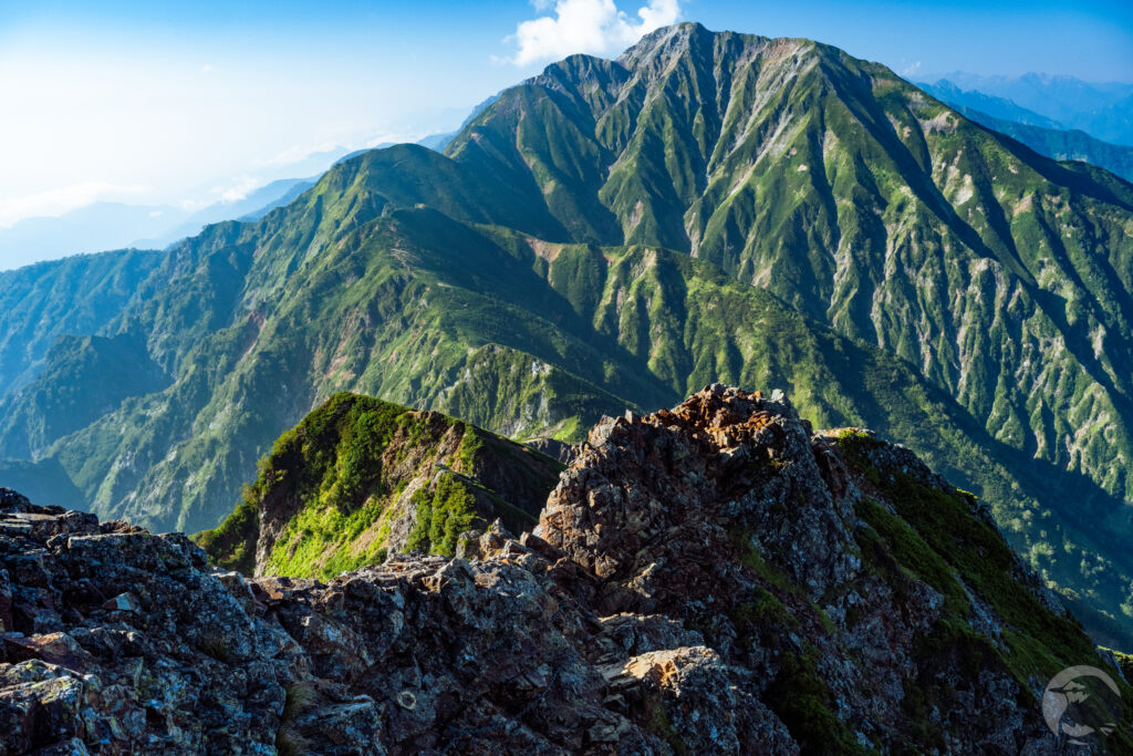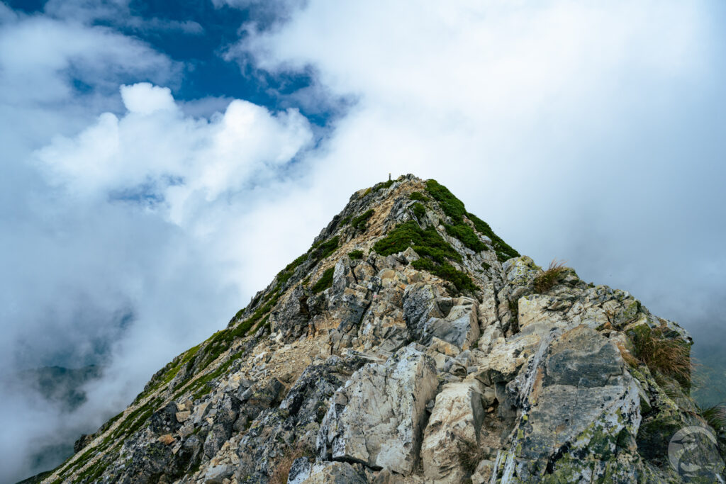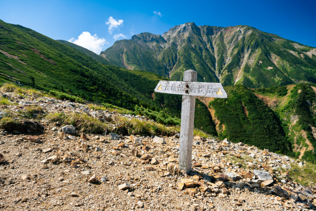 五竜岳は唐松岳の南に位置する山で日本百名山の一座。重厚で貫禄のある山容を誇り、剥き出しの岩場が人を寄せ付けぬ威厳を感じさせる山です。唐松岳同様に東麓の白馬五竜スキー場からゴンドラに乗ってアプローチ出来るので、北アルプスの中では登りやすい山といえます。ただし登山道の遠見尾根は危険箇所こそ無いものの長い道のりである上に、五竜岳山頂直下は滑りやすい岩場が続くので、唐松岳と比べると少し難易度が上がります。