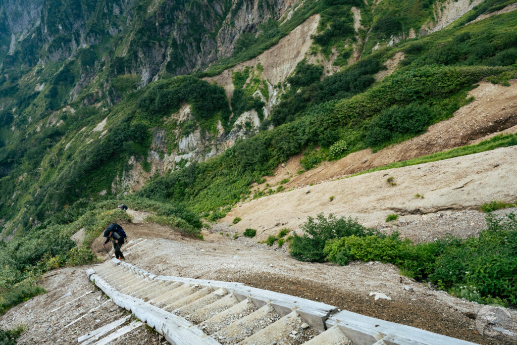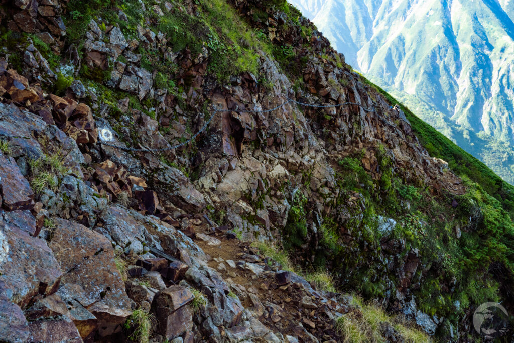 牛首の鎖場と五竜岳。道の右側がストンと切れ落ちているのでかなり高度感があります。足場は結構広くてグリップも効くので見た目ほど難しい道ではない印象です。