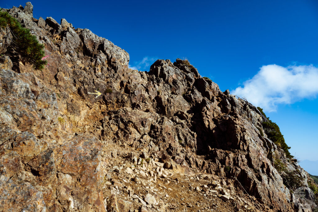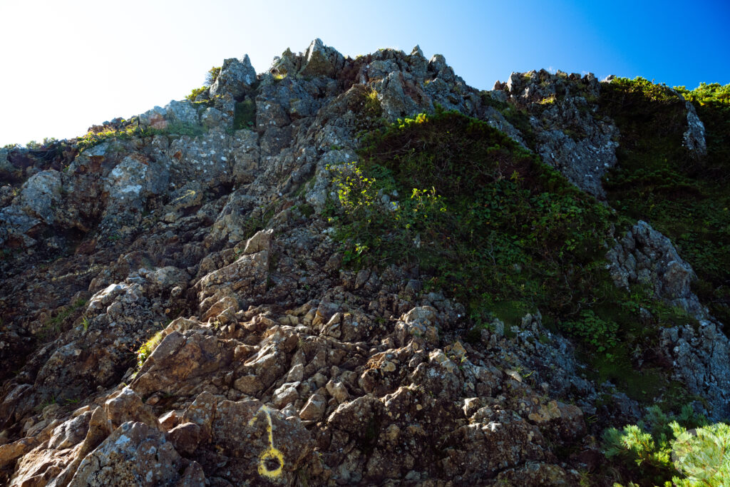 先ほどの岩場をトラバースした後は少し長めの岩場の下りがあります。こちらは下った後に振り返って見上げた写真になります。岩が角張っているので足を置きやすいのがありがたいです。