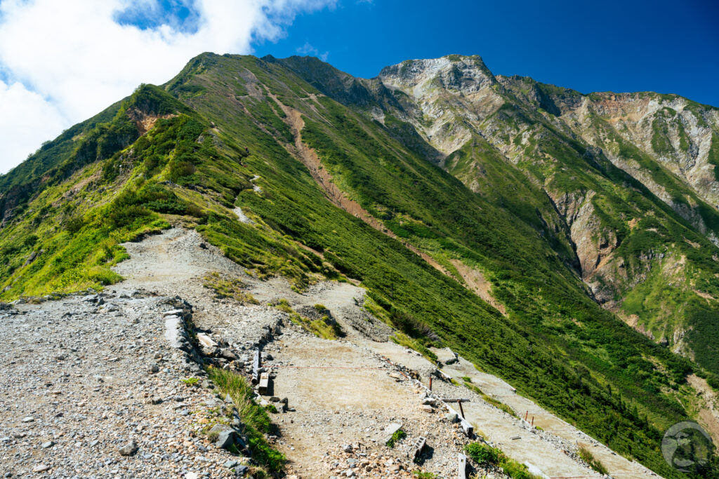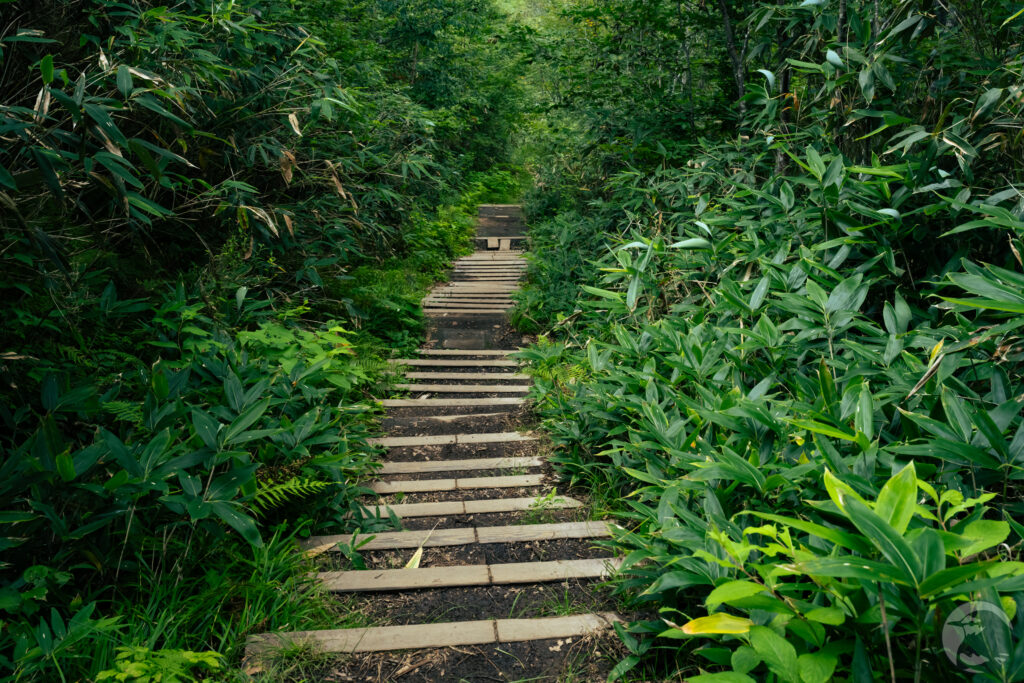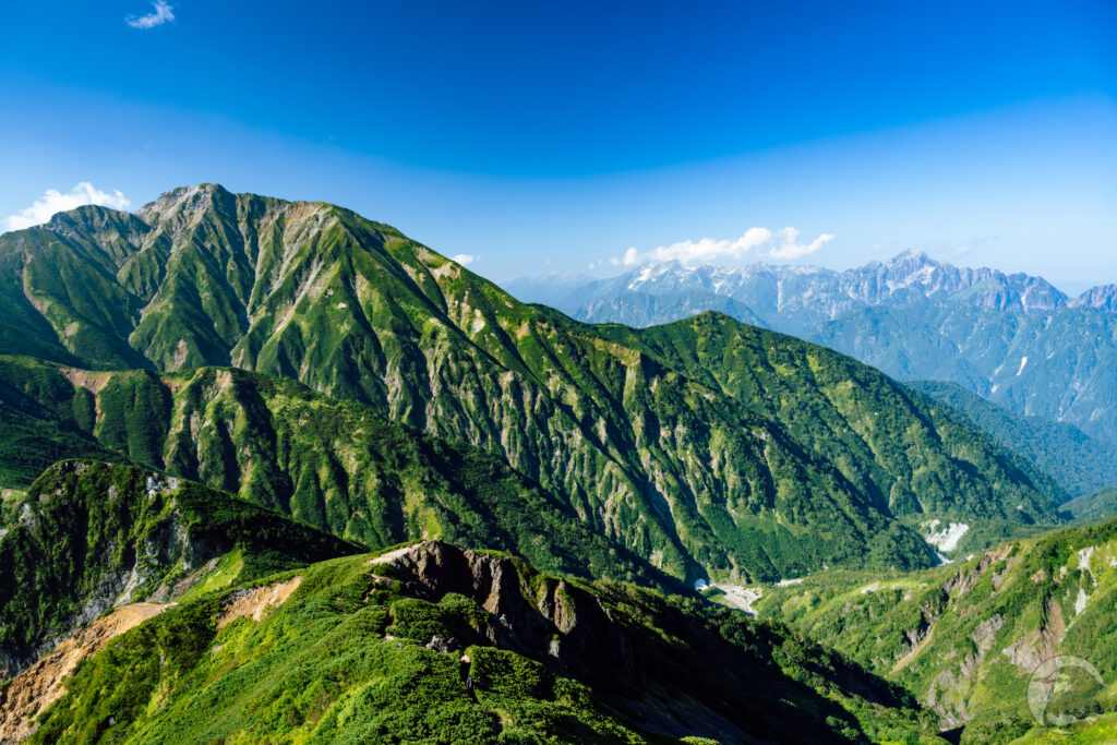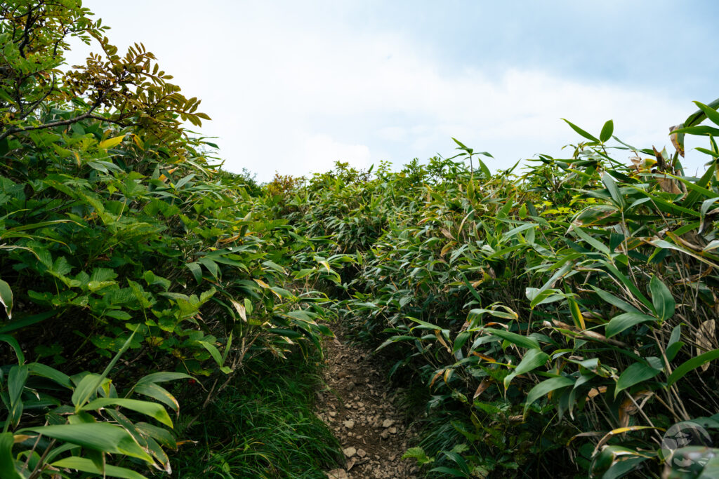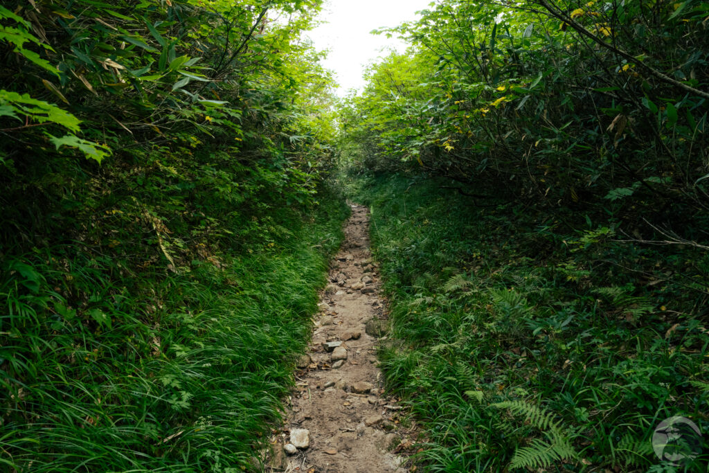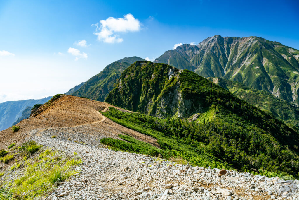 夏空の下で鮮やかに輝く緑、その中に通る道。自然の中に身を投じるという山歩きの本質を象徴するかのような景色に心が躍ります。