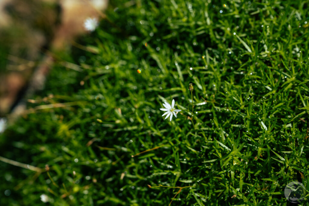 岩場、ザレ場を過ぎると草木が増えてきて、道端に咲くイワツメクサやオヤマリンドウが目につきます。