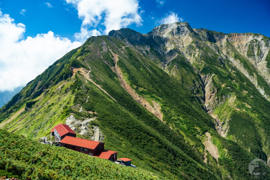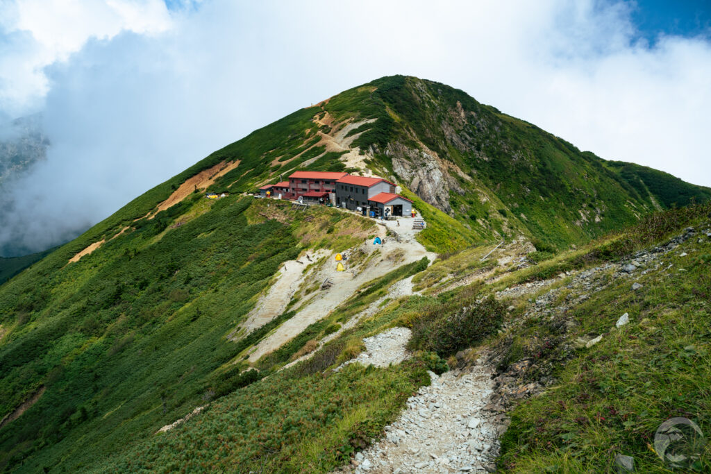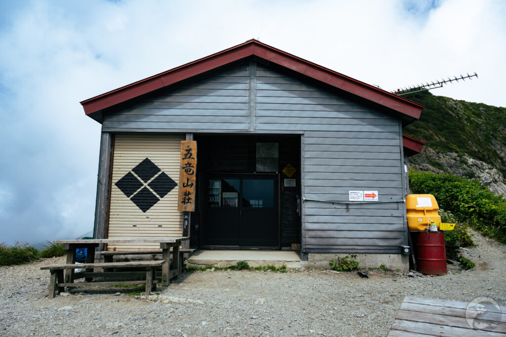 五竜山荘は左手にテント場があり、唐松岳頂上山荘と比べると結構近いのでテント泊初心者の方はこちらの方が安心感がありそうですね。小屋正面の武田菱がクールな建物です。