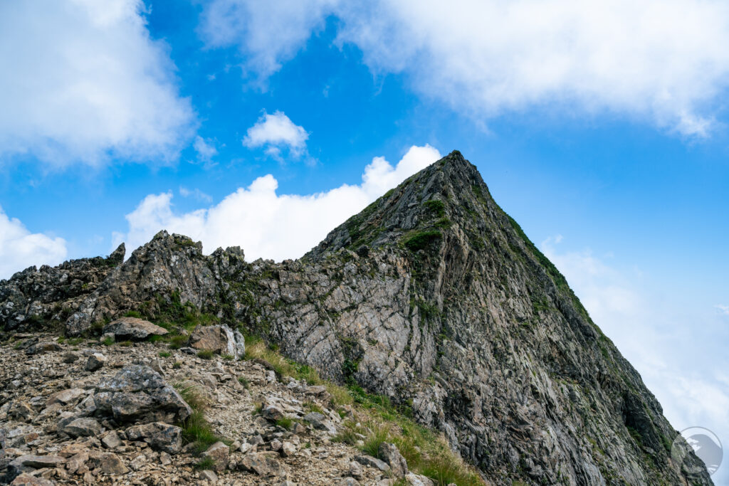 最初の方はひたすらザレ場、道は広くて歩きやすいです。左手に聳え立つピラミッドを通り過ぎると鎖場が現れます。ここは鎖を持たなくても行けるぐらいの易しい岩場でした。