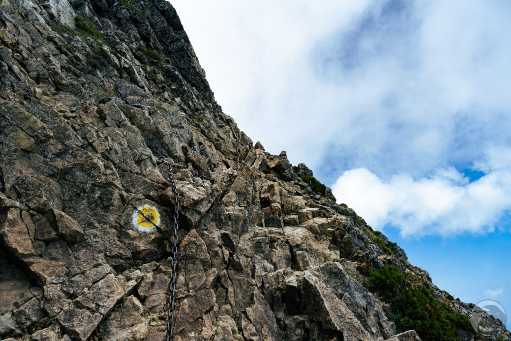 最初の鎖場を越えた先に待つ山頂直下の岩場が今回の大本命。転んでカメラをぶつけたら洒落にならないのでザックにしまっていきます。
