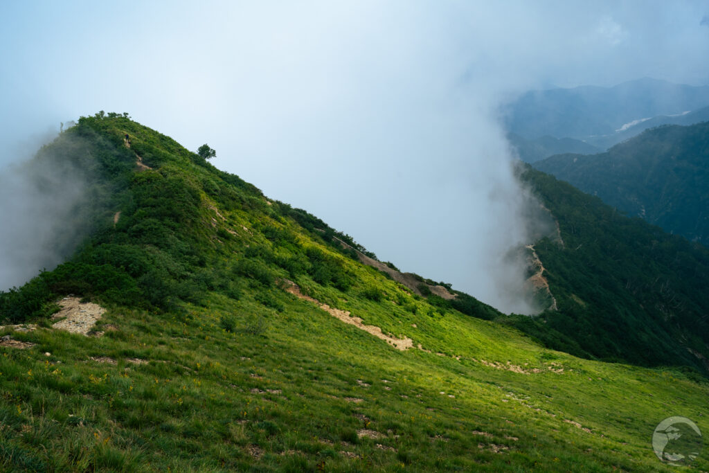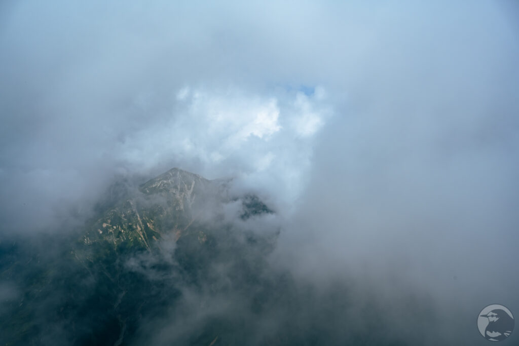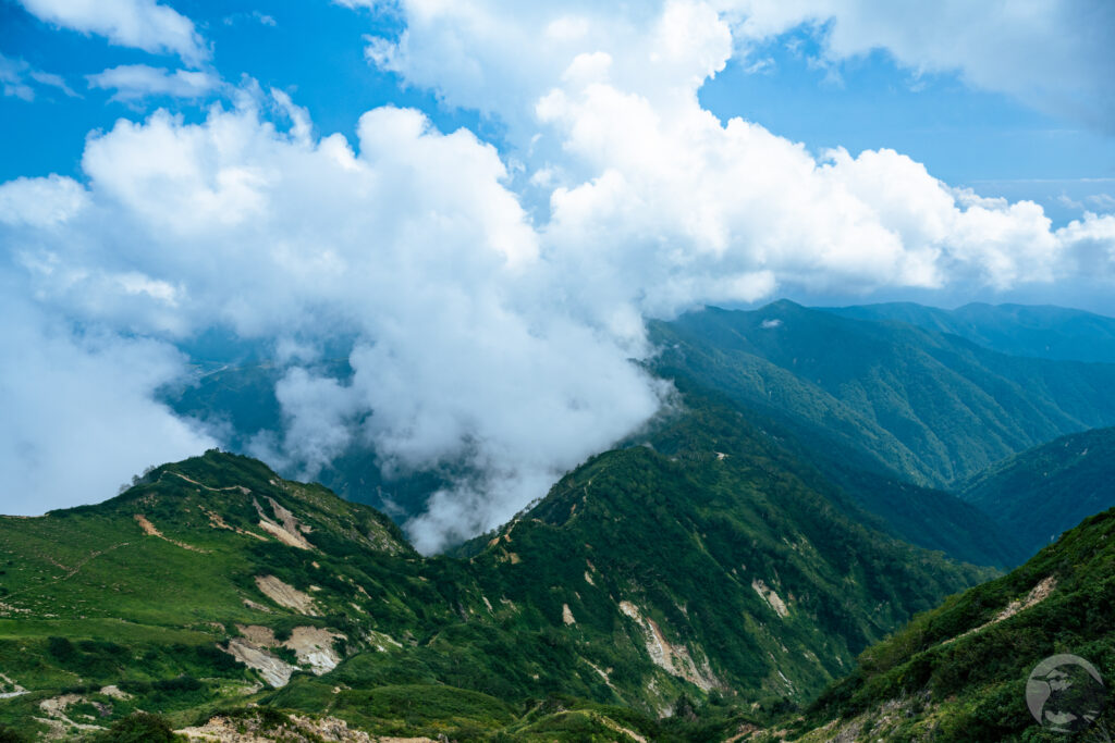この辺りから下りの遠見尾根を見渡せます。雲がもこもこ湧いてきて遠見尾根にぶつかっているのが見えます。