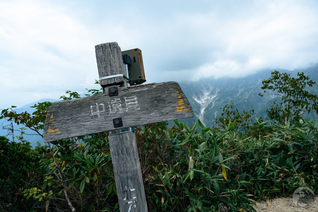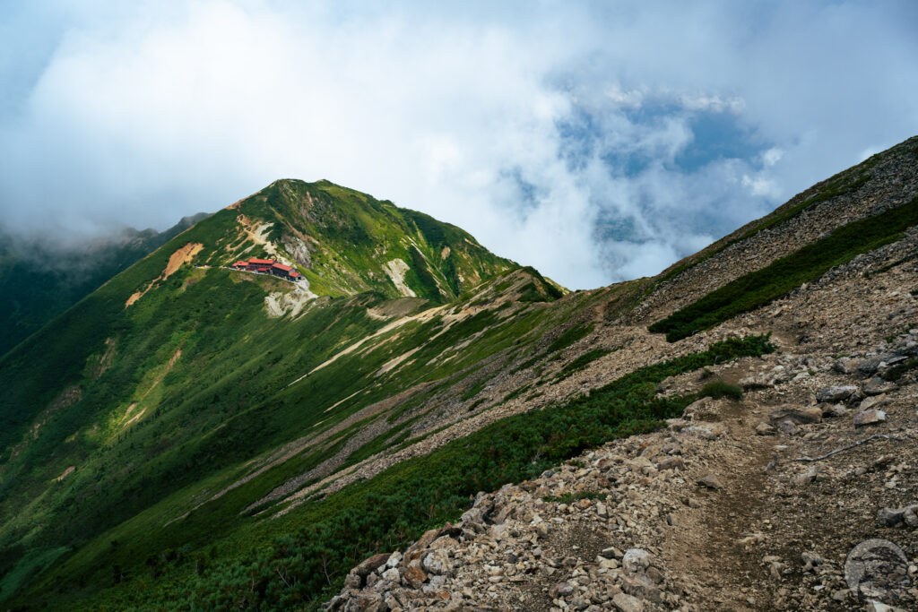 五竜山荘前、右下に見えるのがテント場です。一日目の唐松岳頂上山荘で見かけた方が居たので少しお話しました。アクションカメラで風景やタイムラプスを撮っていたので興味がわき、導入してみたいなーなどと思ったのでした。これから天気が下り坂だからお気をつけてとお互い声を掛け合いました。