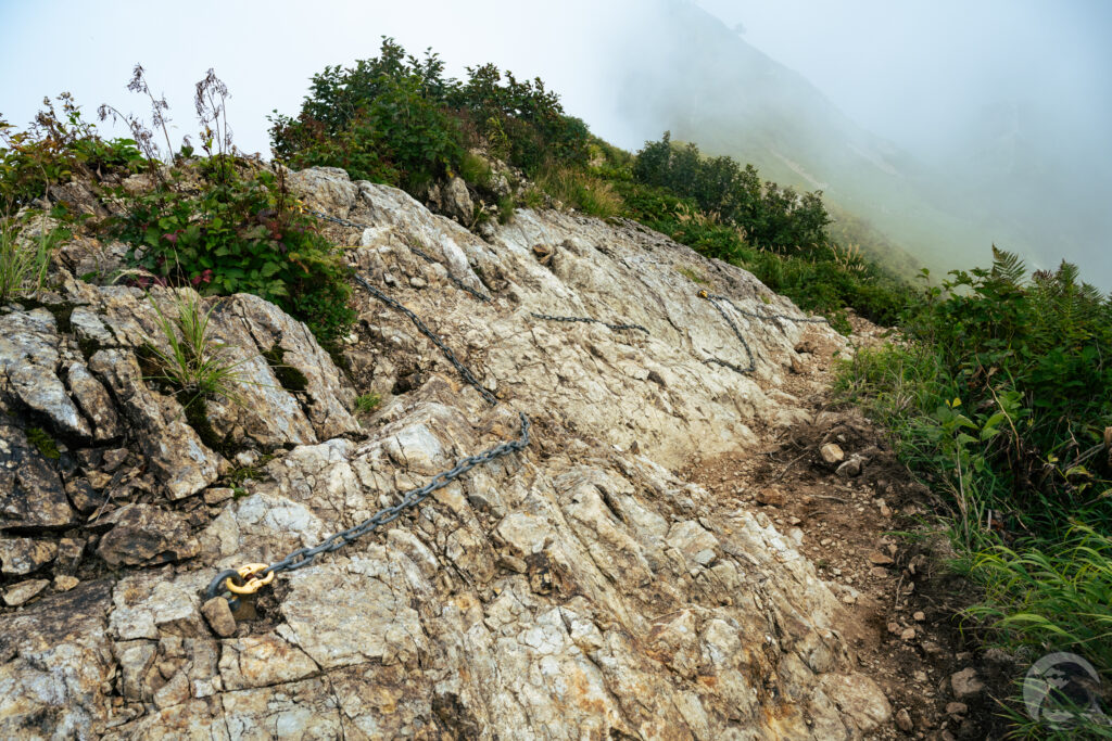 ちょっと進んだらまた鎖場があります。一部足の置き場がほとんどない場所があるのでしっかりつま先で踏ん張って越えていきます。