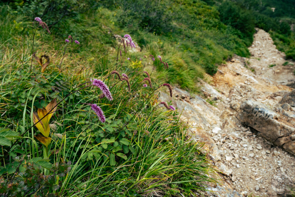 岩場を越えてササ林を抜けたら登山道脇にはカライトソウが揺れていました。